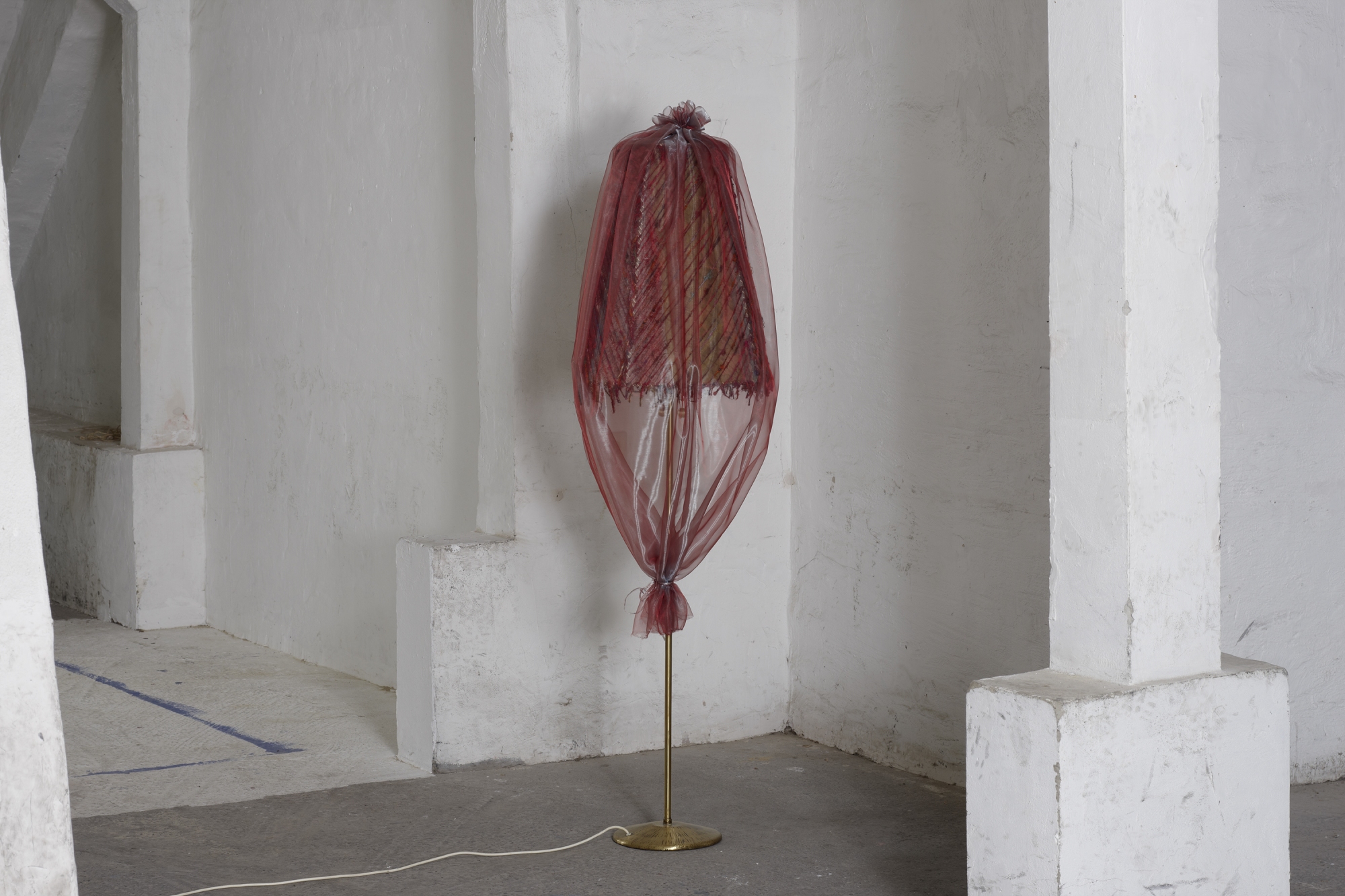 Material: Lampenschirm, Wachsmalkreide, Seidengarn, Organza, Messingständer