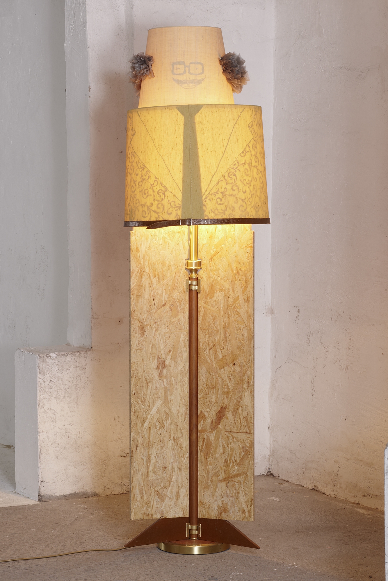 Material: Holz-/Metallständer, Leder, Lampenschirmseide auf Hartfolie, Organza, Wachsmalkreide